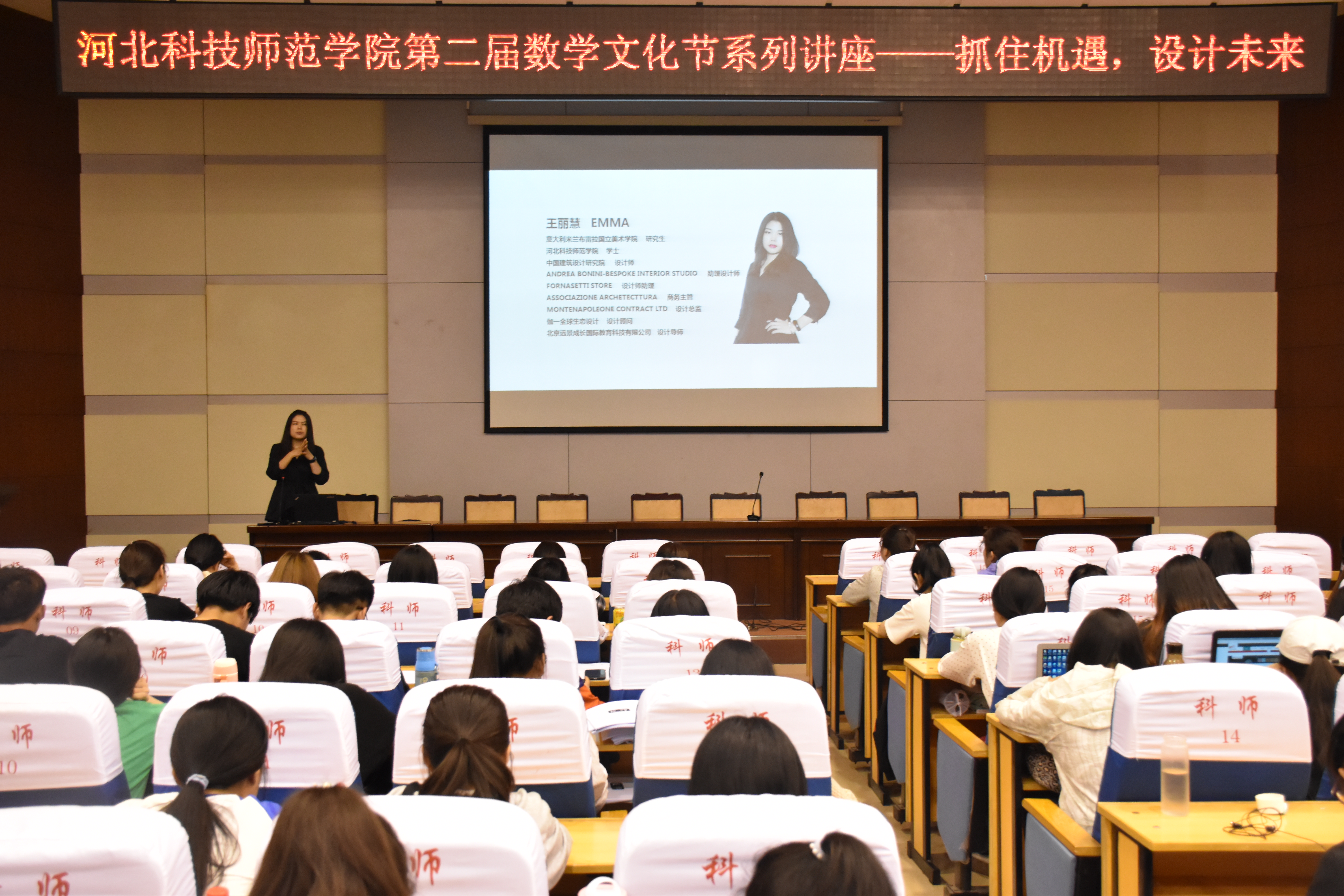 2019年5月16日下午,太阳成集团tyc33455ccwww在秦皇岛校区学术交流中心举办了学校第二届数学文化节系列讲座。特邀中国建筑设计研究院设计师王丽慧作题为“抓住机遇,设计未来”的专题报告,太阳成集团tyc33455ccwww的数学与应用数学、应用统计、计算机科学与技术、数字媒体技术等各专业师生400余人聆听了此次专题报告。